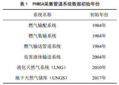 自1970年以來(lái), PHMSA就開(kāi)始收集管道基礎信息,歷年來(lái)基礎信息采集的報告格式已經(jīng)變更了7次。從1984年起, PHMSA開(kāi)始對收集的數據按照管道系統的類(lèi)型進(jìn)行分類(lèi),不同管道系統初始分類(lèi)的年份詳見(jiàn)表 1。