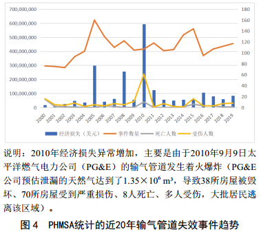2000~2019年20年間, PHMSA共收到2 190起輸氣管道失效事件報告,累計造成49人死亡、 175人受傷,經(jīng)濟損失21.24億美元;平均每年110起,每年2人死亡、 9人受傷,每年經(jīng)濟損失1.06億美元。近20年P(guān)HMSA統計的輸氣管道失效事件趨勢如 圖 4所示。