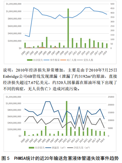 2000~2019年20年間, PHMSA共收到7 314起輸送危害液體管道失效故事件報告,累計造成29人死亡、 81人受傷,經(jīng)濟損失達到39.55億美元,泄漏總量 2 9 . 5 7萬(wàn) m 3,凈泄漏損失量 1 7 . 8 7萬(wàn) m 3;平均每年 3 6 6起,每年1人死亡、 4人受傷,每年經(jīng)濟損失1.98億美元,每年泄漏總量1.48萬(wàn) m 3,每年凈泄漏損失量 0 . 8 9萬(wàn) m 3。 P H M S A統計的近20年輸送危害液體管道失效事件趨勢如圖 5所示。