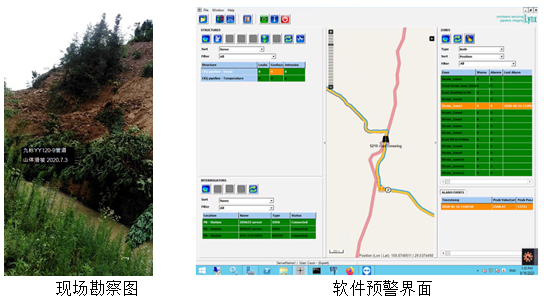 項目交付運營(yíng)后,2020年6月15日上午8點(diǎn),監測系統發(fā)出應變預警,現場(chǎng)實(shí)地探查發(fā)現,因公路修繕和雨水積留,導致發(fā)生山體滑坡。系統的及時(shí)預警得以在現場(chǎng)情況惡化前及時(shí)處理,避免了資產(chǎn)損失。