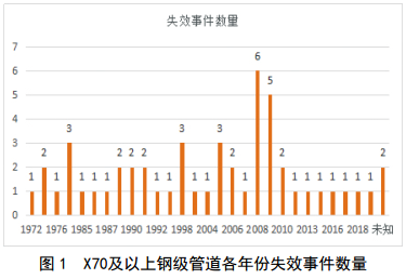 管道失效事件數量與管道建設年代總體分布較均勻,其中2008年、 2009年建設的管道失效事件數量突出(圖 1)。
