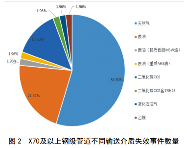 主要失效管道的輸送介質(zhì)分別為天然氣(28起,54.9%)、原油(13起, 25.5%)和二氧化碳CO2(8起, 15.7%),其他為液化石油氣(1起, 1.96%)和乙烷(1起, 1.96%),見(jiàn)圖 2。