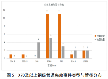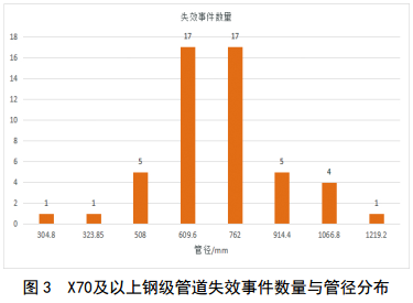 管道失效事件主要發(fā)生在609 mm (1 7 起 ,33.3%)和762 mm(17起, 33.3%)管徑的管道,X70及以上鋼級大口徑管線(xiàn)(>508 mm)失效事件數量約為小口徑(≤508 mm)管線(xiàn)的6倍(圖 3)。