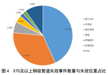 失效位置管體(22起, 43.1%)與焊縫(環(huán)焊縫、管體焊縫、焊縫、焊縫配件)大致相當(23起,45.1%),見(jiàn)圖 4。