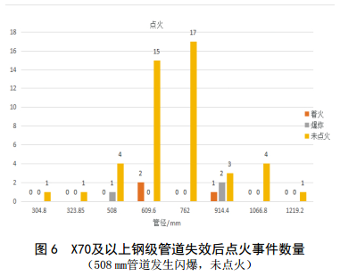 如圖 6所示,管道失效后發(fā)生點(diǎn)火事件6起,著(zhù)火3起、爆炸3起(其中914.4 mm管道同時(shí)發(fā)生著(zhù)火爆炸),未點(diǎn)火事件46起?傮w來(lái)講,點(diǎn)火的可能性為9.8%(即(1-46)÷51 = 0.098),點(diǎn)火后出現著(zhù)火或爆炸的幾率大致相當。