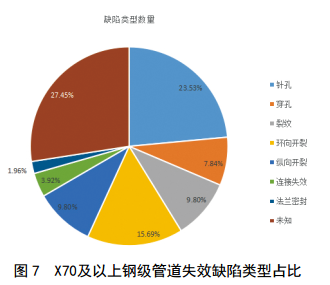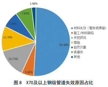 失效主要原因為制造與施工缺陷(材料失效、施工/材料缺陷)共29起,占比56.9%;第三方損壞(開(kāi)挖損傷)共7起,占比13.7%;腐蝕共6起,占比11.8%;自然與地質(zhì)災害(自然災害)和誤操作各4起,分別占比7.84%;其他為1起,占比1.96%(圖 8)。