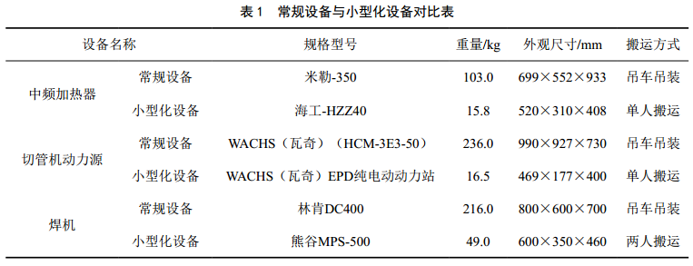 在保證搶修機具設備功能正常、滿(mǎn)足作業(yè)要求的前提下,將其小型化、輕量化、便捷化,替代原常規設備,可高效快捷完成裝車(chē)和山區進(jìn)場(chǎng),以確保在有限時(shí)間內完成搶修作業(yè)。常規設備與小型化設備對比見(jiàn)表 1。選型之初即已滿(mǎn)足小型化要求的設備見(jiàn)表 2。