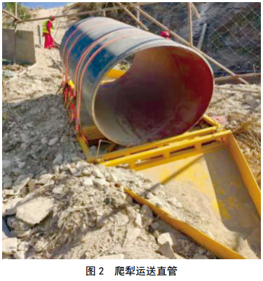 (1)爬犁運輸系統架設。先行在山頂和山腳分別安裝卷?yè)P機(絞車(chē)),并與地錨連接固定,然后將爬犁的兩端分別與兩臺卷?yè)P機連接。爬犁行走路徑需選擇盡量平整的坡面,但仍不可避免在橫向上遇到大角度側坡,為避免運送爬犁發(fā)生大位移的側滑,需使用輔助導向索。經(jīng)試驗,此系統能夠成功運送直徑1 219 mm、長(cháng)2 m的管道短節至坡面作業(yè)點(diǎn),見(jiàn)圖 3。另外,山區道路坡度較大,采用此爬犁系統運送小型化搶修設備,可避免人工搬運,確保安全。