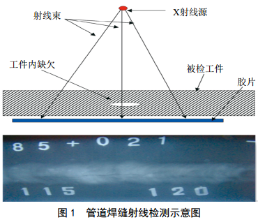 天然氣管道射線(xiàn)檢測常用射線(xiàn)照相法,即用X射線(xiàn)或γ射線(xiàn)穿透試件,以膠片作為記錄信息的無(wú)損檢測方法。如圖 1所示。