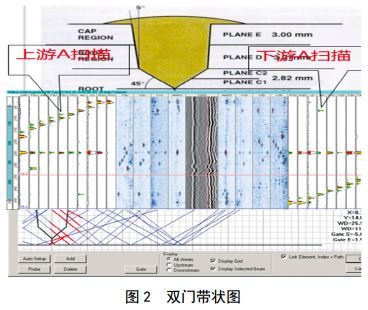 (2) AUT檢測。采用相控陣技術(shù),只使用一對相控陣探頭(一般為60陣列,相當于60個(gè)常規探頭),完成A掃描、 B掃描、 TOFD(超聲波衍射時(shí)差法)及聲耦合顯示缺陷方法。其中, A掃描,負責檢測焊縫坡口面上的面積型缺陷; B 掃描,負責檢測焊縫體積型缺欠; TOFD掃描負責檢測盲區的缺陷。管道檢測雙門(mén)帶狀圖如圖 2所示[3]。