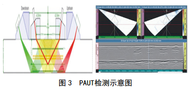 (3) PAUT檢測。使用微型探頭陣列產(chǎn)生超聲波束,通過(guò)建立聚焦規則使電子裝置控制每個(gè)陣列單元的發(fā)射和接收時(shí)間,從而產(chǎn)生出多個(gè)超聲波束,通過(guò)控制陣列的激發(fā)和接收時(shí)間,控制波束角度、聚焦深度、聚焦尺寸等,實(shí)現工件的快速掃描成像,如圖 3所示。