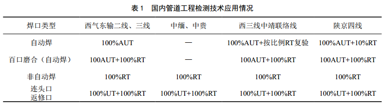 3.1 國內管道工程檢測技術(shù)應用情況(表 1)