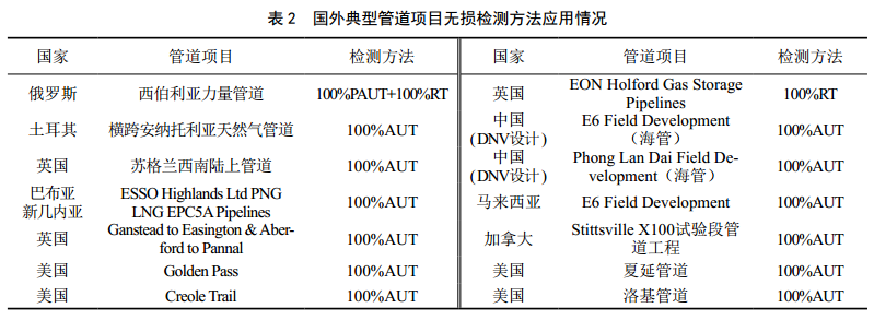3.2 國外典型管道項目無(wú)損檢測方法應用情況(表 2)