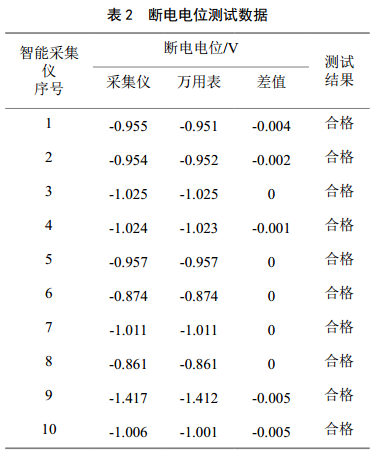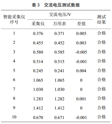 本次調試采用萬(wàn)用表(經(jīng)鑒定合格的Fluke289)測試數據與智能采集儀自動(dòng)采集數據進(jìn)行比對,檢查智能采集儀測量精度(要求與Fluke289直流電壓、交流電壓小于5 mV可以進(jìn)行安裝,否則進(jìn)行校正或更換),測試數據見(jiàn)表 1、表 2、表 3。