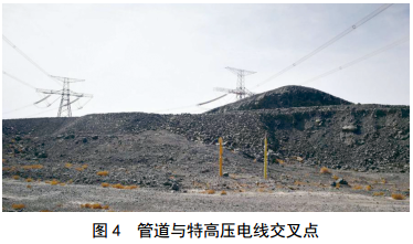 2019年11月29日管道維護人員現場(chǎng)對管道電位進(jìn)行測試,與智能電位測試儀反饋的數據完全吻合。觀(guān)察該段管線(xiàn)周?chē)闆r,有兩條特高壓直流(HVDC)輸電線(xiàn)路(分別是吉泉線(xiàn)±1 100 kV、哈鄭線(xiàn)±800 kV)垂直經(jīng)過(guò)管道(圖 4)。為此分析,可能是受到特高壓線(xiàn)路影響[4-5]。