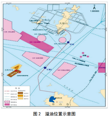 馬目油庫—魚(yú)山輸油管道位于航道和錨地的集中區域,且周邊分布的海底管線(xiàn)多,易遭受外部因素如鋪管作業(yè)或拋錨、錨拖曳、錨鏈磨損管道、沉船等對管道造成損傷。管道登陸段南側區域距離沖刷槽很近,路由區最大沖刷幅度約1.0 m~2.5 m,存在懸空斷裂風(fēng)險。管道一旦泄露溢油,在潮流及風(fēng)海流作用下,溢油范圍隨泄漏后時(shí)間增長(cháng)而擴大,將嚴重污染海域及周邊環(huán)境。
