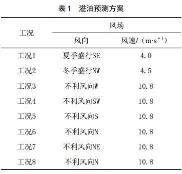根據氣象條件,海底管道所在海域附近夏季盛行SE向風(fēng),冬季盛行NW向風(fēng),年主導風(fēng)向為SE向。按《船舶污染海洋環(huán)境風(fēng)險評價(jià)技術(shù)規范(試行)》要求,選取對主要敏感目標最不利的風(fēng)向為不利風(fēng)向,風(fēng)速為相應的年平均風(fēng)速。管道環(huán)境敏感區域位于管道北側、南側及東側,油污對周邊的海洋保護區造成危害為不利情況,故根據溢油點(diǎn)和環(huán)境敏感區域位置,試算后選擇不同的不利風(fēng)向分別為W、 SW、 S和N向風(fēng)[3]。故本次預測主要考慮SE向風(fēng)、 NW向風(fēng),以及不利風(fēng)向W、 SW、 S和N向風(fēng),風(fēng)速取多年平均風(fēng)速,不利風(fēng)向時(shí)取最大不利風(fēng)速10.8 m/s。選擇高平潮時(shí)刻進(jìn)行溢油預測,工況見(jiàn)表 1。