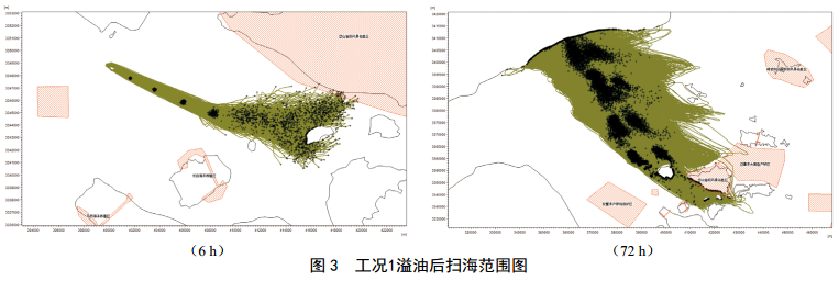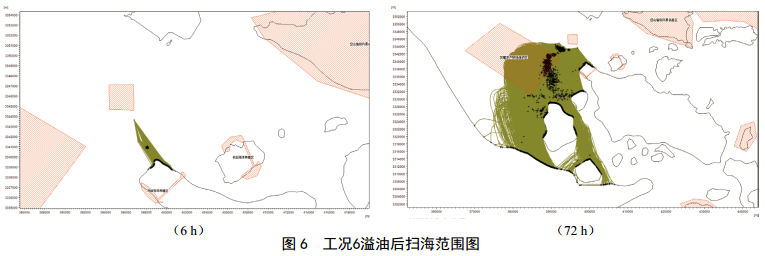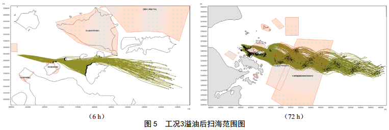 CB1發(fā)生溢油事故后,工況1(高平潮, SE風(fēng)向, 4.0 m/s風(fēng)速) 6 h掃海面積61.2 km2, 72 h后掃海面積為3 525.5 km2;工況3(高平潮, W風(fēng)向,10.8 m/s風(fēng)速) 6 h掃海面積195.7 km2, 72 h后掃海面積為8 026.8 km2(圖 5);工況4(高平潮, SW風(fēng)向, 10.8 m/s風(fēng)速) 6 h掃海面積93.8 km2, 72 h后掃海面積最大,為10 542.4 km2;工況6(高平潮, N風(fēng)向, 10.8 m/s風(fēng)速) 6 h掃海面積為8.2 km2, 72 h后掃海面積為759.5 km2(圖 6)。不同風(fēng)向對環(huán)境敏感區域溢油的響應時(shí)間各不相同,最快1 h溢油到達環(huán)境敏感目標區域,主要敏感目標中五峙山列島鳥(niǎo)類(lèi)自然保護區受影響最嚴重。