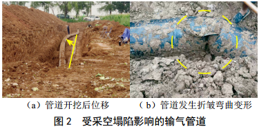 采空塌陷區內的管道由于受到擠壓、拉拽,經(jīng)常出現位移、翹曲,嚴重時(shí)發(fā)生彎曲變形,管道本體出現褶皺變形(圖 2),嚴重時(shí)造成管道拉裂、爆炸、輸氣中斷等,影響居民生活和企業(yè)生產(chǎn)。如2018年1月,山西三晉天然氣長(cháng)輸管道(長(cháng)子縣-長(cháng)治縣段)受采空區地表沉陷影響,造成管道局部地段應力發(fā)生變化,管道被拉裂漏氣,導致長(cháng)治市短時(shí)間內供氣量減少32萬(wàn)立方米。