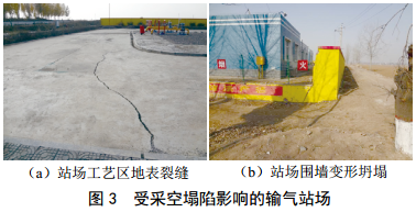 采空塌陷范圍內地表被拉裂,形成拉張裂縫,同時(shí)由于差異性沉降,地面形成錯臺。位于塌陷區輸氣 站場(chǎng)多形成裂縫,工藝管道受不同方向作用力而發(fā)生應力集中,影響運行安全;輸氣站場(chǎng)內的建筑物、圍墻等受拉力、剪切力的作用,墻體出現裂縫甚至坍塌(圖 3)。
