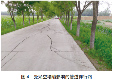 采空塌陷使輸氣管道工程的伴行路也出現拉張裂縫和錯臺,給進(jìn)行管道日常維護的車(chē)輛和人員通行造成困難(圖 4)。