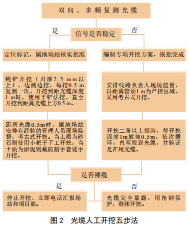 編制了“光纜人工開(kāi)挖五步法”(圖 2),將每處作業(yè)坑光纜視作裸纜、盤(pán)纜,全程采用鈍鏟開(kāi)挖,每開(kāi)挖0.5 m對光纜復測1次,距離光纜0.5 m時(shí)定為嚴控區,改為用手“考古式”開(kāi)挖,由場(chǎng)站負責人現場(chǎng)督導。砂石軟土采用小耙子類(lèi)工具,若為淤泥改用戴防割手套徒手清理,杜絕人為損傷光纜;人工開(kāi)挖受限時(shí),嚴格執行機械輔助作業(yè)專(zhuān)項方案審批流程,已累計申請機械輔助吊裝蓋板、吊裝涵管、破路破渠、倒運土方等作業(yè)共計560余處。