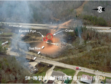 2012年12月11日,美國Columbia公司運營(yíng)的SM-80州際天然氣管道在西弗吉尼亞州西森維爾鎮附近發(fā)生斷裂著(zhù)火事故,造成多處房屋受損,距離事故點(diǎn)30米的77號公路的瀝青路面受損、交通長(cháng)時(shí)間中斷。事故原因和暴露的問(wèn)題主要包括:外腐蝕沒(méi)有得 到有效控制,防腐層破損、回填石塊屏蔽陰極保護電流造成管道外壁發(fā)生嚴重腐蝕,最終導致韌性斷裂;未充分識別管道失效對附近公路的影響,未將事故管段納入完整性管理程序。