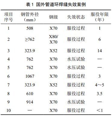 根據不完全統計,北美地區在過(guò)去2~3年內發(fā)生10次管道失效事故、多數為X70鋼級管道環(huán)焊縫失效,詳見(jiàn)表 1。