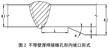 (4)改進(jìn)不等壁厚坡口設計。變壁厚處坡口焊接質(zhì)量差,易出現焊縫缺欠/缺陷和產(chǎn)生較大應力集中,當管道受到外部載荷作用時(shí),將一定程度擴大載荷應力。以中俄東線(xiàn)為例,對于常規內部打磨斜坡的不等壁厚坡口,應力集中系數在1.16~1.29之間。為減少應力集中,優(yōu)化焊縫成型質(zhì)量,結合應力計算結果,設計人員提出錐孔形坡口設計,即在厚壁管內部加工錐孔形坡口以實(shí)現等壁厚對接的目的,詳見(jiàn)圖 2。采用該圖形式的坡口,不同壁厚組合計算得到的應力集中系數在1.04~1.08之間。