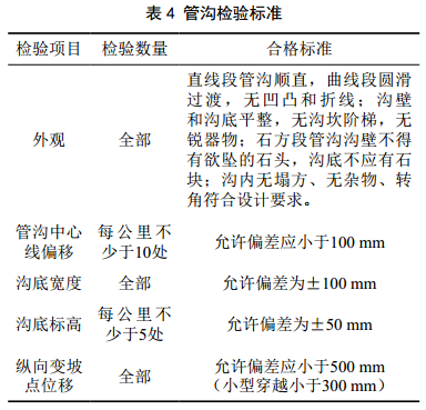 (6)連頭口位置及驗溝要求。明確提出連頭口應選擇在直管段上,距離彎管的曲線(xiàn)段不應小于24 m,同時(shí)避免連頭口設在不等壁厚焊縫處,以降低組對時(shí)應力集中。管溝成型后應進(jìn)行檢查,管溝檢驗項目、數量、方法及合格標準見(jiàn)表 4。