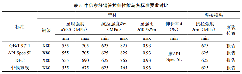 (2)縮小鋼管強度范圍。管材性能指標在已有設計及管材標準中均有規定。中俄東線(xiàn)對X80管線(xiàn)鋼屈服強度上限由705 MPa降為675 MPa,抗拉強度上限由825 MPa降為765 MPa,為管材與焊材強度匹配奠定了基礎(表 5)。