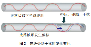 當光信號輸送進(jìn)光纖時(shí),系統軟件探測器會(huì )處理接收到的光信號的相位,當傳感光纜受到觸碰或振動(dòng)的干擾時(shí),光信號的傳輸模式就會(huì )發(fā)生變化(圖 2)。