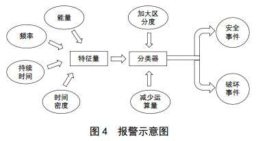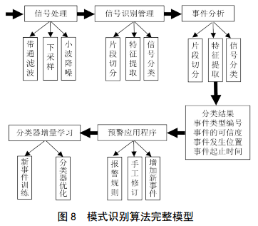 其中,分析算法的核心內容是首先對采集到的數據進(jìn)行降噪預處理,然后再通過(guò)各種方法對信號進(jìn)行識別分類(lèi),分類(lèi)完成后根據其振動(dòng)的強度、頻率特征等與預先訓練好的分類(lèi)模型進(jìn)行對比,從而得到對事件的初步分析結果。