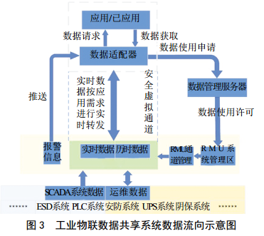 西南管道公司以中緬原油管道(國內段)站場(chǎng)為試點(diǎn),建設了中緬原油管道工業(yè)物聯(lián)數據共享系統,形成西南管道公司自有的工業(yè)數據共享管理系統。該 系統采用分布式架構,不設統一數據中心,以“去中心化”的方式將站場(chǎng)的生產(chǎn)數據本地存儲;同時(shí),應用“詢(xún)問(wèn)—應答”工作機制,為站場(chǎng)的工業(yè)設備提供端到端的鏈路管理,可以根據不同應用對工業(yè)數據的需求,有針對性地提供數據服務(wù)。該系統的優(yōu)點(diǎn)是:減輕企業(yè)數據中心的壓力;通過(guò)統一平臺向各應用提供運行基礎數據,避免設備本體的應答沖突;通過(guò)設置不同的訪(fǎng)問(wèn)權限,可以達到不同范圍的數據應用。 圖 3所示為工業(yè)物聯(lián)數據共享系統的數據流向示意圖。