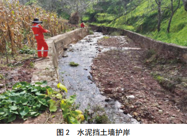 該類(lèi)水毀治理措施主要有:擋土墻護岸基礎外露、懸空段,加固擋土墻基礎,使擋土墻基礎不受水流沖刷,并夯實(shí)加固地基,使地基具有足夠的承載力,確保墻身穩固。擋土墻垮塌段,應及時(shí)修建新的擋土墻護岸。上述兩種方法通常配合在擋土墻下游增設淤土壩共同使用(圖 2)。