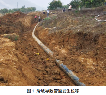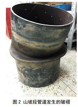 圖 1為臨近道路施工誘發(fā)山體滑坡,開(kāi)挖后的管道發(fā)生明顯移位。圖 2為某管道山地敷設段因滑坡而發(fā)生皺褶,引發(fā)了介質(zhì)泄漏。從山地管道失效案例可以總結管道失效原因:一是對管道受到的外部載荷估計不足,往往是管道發(fā)生事故之后,才意識到管道受到嚴重的載荷作用;二是管道的應變能力不足,土體擾動(dòng)即可能導致管道失效;三是管道的防護結構(如擋土墻等)保護能力不足,某些因素可能致其先行損壞,未能對管道起到足夠的防護作用。