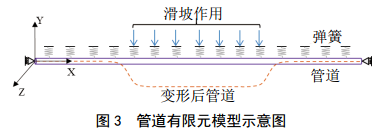 山地管道的力學(xué)行為往往是復雜的,采用解析計算方法較難處理此類(lèi)問(wèn)題,而采用有限元方法較為可行[4],這也是目前普遍采用的方法。在有限元方法中,管土間相互作用采用土彈簧模型化,通過(guò)彈簧的剛度及自由度反映土質(zhì)類(lèi)型及土體運動(dòng)形式,包括軸向、橫向及豎向土彈簧,軸向土彈簧反映了土體與管道間的軸向作用力及位移關(guān)系,橫向及豎向土彈簧反映了土體與管道的橫向作用力與位移關(guān)系。