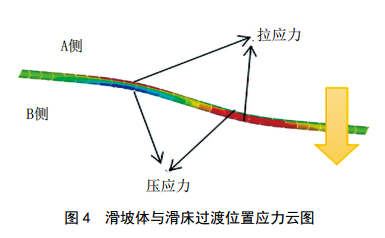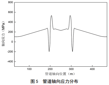 有限元分析得到管道的應力分布情況如圖 4及圖 5所示。從圖 4可以看到,在滑坡體與滑床過(guò)渡位置為應力突變處,管道A、B側的應力均發(fā)生了由受拉應力到受壓應力的轉變,該處位置是管道的危險段,如果管道的變形較大,可能會(huì )在該處發(fā)生斷裂。圖 5為從管道B側提取得到的軸向應力分布情況,從圖中可以看到,應力在滑坡體與滑床過(guò)渡位置發(fā)生顯著(zhù)變化。最大壓應力位于滑床區域,其值為200 MPa,最大拉應力位于滑坡體內,其值為528 MPa,此應力已經(jīng)超過(guò)管道屈服強度,發(fā)生塑性變形,應采取必要的措施降低管道受到的應力。