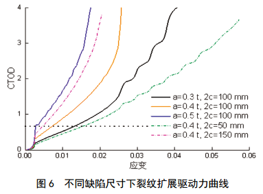 針對高鋼級管道環(huán)焊縫斷裂問(wèn)題,筆者建立了基于應變的斷裂評價(jià)方法[5],包括管道環(huán)焊縫局部力學(xué)性能測試、基于損傷的管道環(huán)焊縫有限元模型、管道斷裂韌性的約束校正等,定量管道環(huán)焊縫的應變能力。在基于應變的斷裂分析中,采用裂紋尖端張開(kāi)角(CTOD)作為參數描述裂紋擴展驅動(dòng)力和裂紋擴展阻力。圖 6是裂紋擴展驅動(dòng)力曲線(xiàn),隨著(zhù)缺陷長(cháng)度2 c(分別取值50 mm、100 mm、150 mm)及缺陷深度a(分別取值0.3 t,0.4 t,0.5 t)的增大,曲線(xiàn)不斷左傾,且斜率越來(lái)越大,表明環(huán)焊縫的應變能力隨缺陷尺寸的增大而逐漸減小。