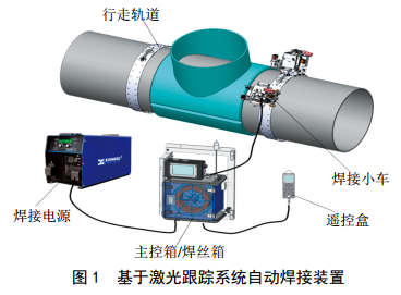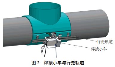 采用單焊炬氣體保護焊完成三通或B型套筒焊接作業(yè),焊接小車(chē)通過(guò)對應的配套行走軌道實(shí)現焊接作業(yè),如圖 2所示。集成激光跟蹤系統,實(shí)現焊接自動(dòng)跟蹤功能;焊接過(guò)程中可微調電流、電壓、行走、擺動(dòng)相關(guān)參數,并實(shí)時(shí)顯示和采集,記錄行程工作日志。