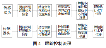 焊接小車(chē)內置焊接調整單元,以根據焊縫跟蹤單元的檢測參數值調整當前待焊接點(diǎn)處的焊接位置及焊槍高度。焊接調整單元包括小車(chē)控制器、焊接電源及焊槍?zhuān)笜尶筛鶕≤?chē)控制器的指令調整擺動(dòng)中心以及高度;小車(chē)控制器接收當前待焊接點(diǎn)處的檢測參數值,并讀取焊槍當前擺動(dòng)中心量,將焊縫的左右偏差量與焊槍當前擺動(dòng)中心量進(jìn)行比對計算,得到左右偏移調整值,進(jìn)而輸出執行擺動(dòng)中心調整指令,實(shí)現焊槍在當前待焊接點(diǎn)處的焊接位置調整;小車(chē)控制器將當前待焊接點(diǎn)處的焊縫高度偏差量與焊槍實(shí)時(shí)高度比對,得到高度偏移調整值,進(jìn)而輸出執行高度調整指令,實(shí)現焊槍在當前待焊接點(diǎn)處的焊槍高度調整(圖 4)。