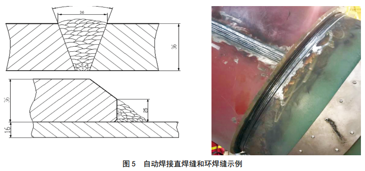 根據以上研究,與廠(chǎng)家合作研制自動(dòng)焊接裝置樣機,在單位廠(chǎng)房模擬中緬油氣管道情況,開(kāi)展該B型套筒自動(dòng)焊接裝置的6G焊接工藝評定工作。焊評委托中國石油天然氣管道科學(xué)研究院焊接技術(shù)中心承擔, Φ 1016 mm B型套筒參數:材質(zhì)Q345R、厚度為 36 mm、長(cháng)度為700 mm。自動(dòng)焊接的直焊縫和環(huán)焊縫如圖 5所示。