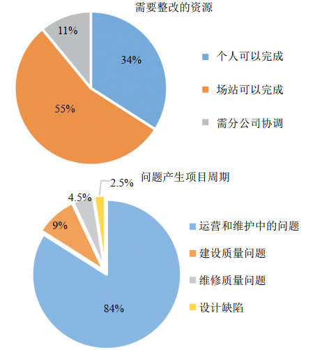 圖 4結果表明,55%為場(chǎng)站可以單獨完成整改的問(wèn)題,應以提高場(chǎng)站管理水平為主要抓手!暗屠蠅摹眴(wèn)題主要發(fā)生在運營(yíng)和維護階段,需要采取措施提高管理水平。