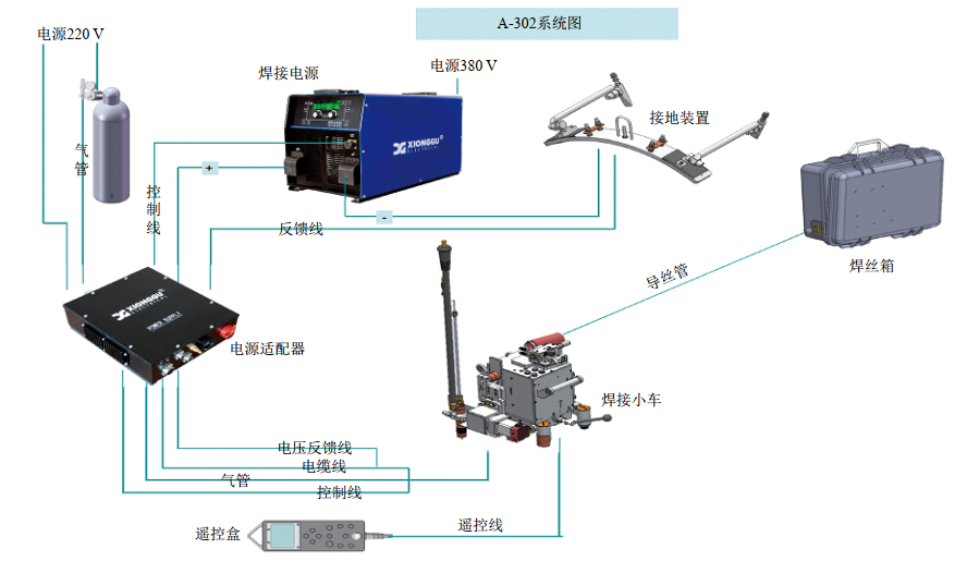 全自動(dòng)焊接系統由焊接電源、混合氣體(80%Ar+20%CO2)通過(guò)電源適配器給焊接小車(chē)供給電源和氣體,由焊絲箱直接向焊接小車(chē)供給焊絲,焊接小車(chē)在軌道上按照程序進(jìn)行焊接動(dòng)作,如圖 1所示。