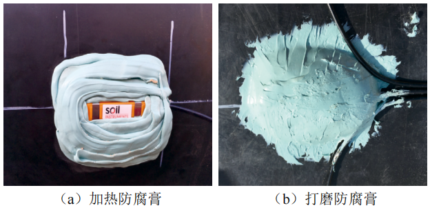 (3)防腐處理。用黏彈體防腐膏按壓在開(kāi)口部分并包裹全部激勵線(xiàn)圈(有效附著(zhù)在金屬表面),使用熱風(fēng)槍加熱防腐膏直至其軟化。順保護罩周?chē)べN防腐膏,直至覆蓋全部打磨區域和保護罩,然后均勻加熱防腐膏至軟塑狀,保證其具有圓滑曲面外形且溢出,開(kāi)口位置不得小于20 mm。
