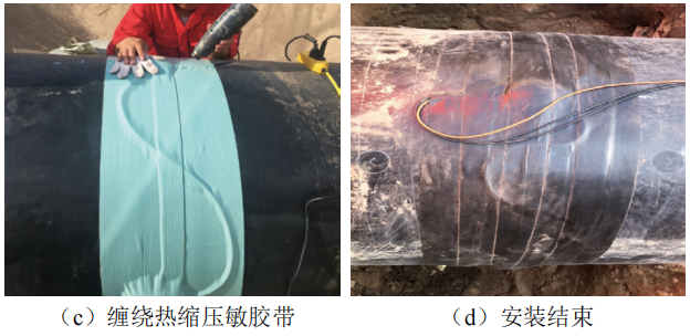 在安裝應變計部位的管道(圖 2),黏貼2整纏圈黏彈體防腐帶(防腐帶規格:寬20 cm、厚1.5 mm),加熱至有效附著(zhù)在管道表面,外表面應平整、無(wú)褶皺、無(wú)氣泡,防腐帶搭接寬度不小于1/2。管道整圈纏繞熱縮壓敏膠帶1層(壓敏帶規格:長(cháng)5 m、寬60 cm、厚2.5 mm)。黏彈體防腐膠帶+熱縮壓敏膠帶防腐層用15 kV電火花檢漏,以無(wú)漏點(diǎn)為合格。測試應變計并記錄數據。
