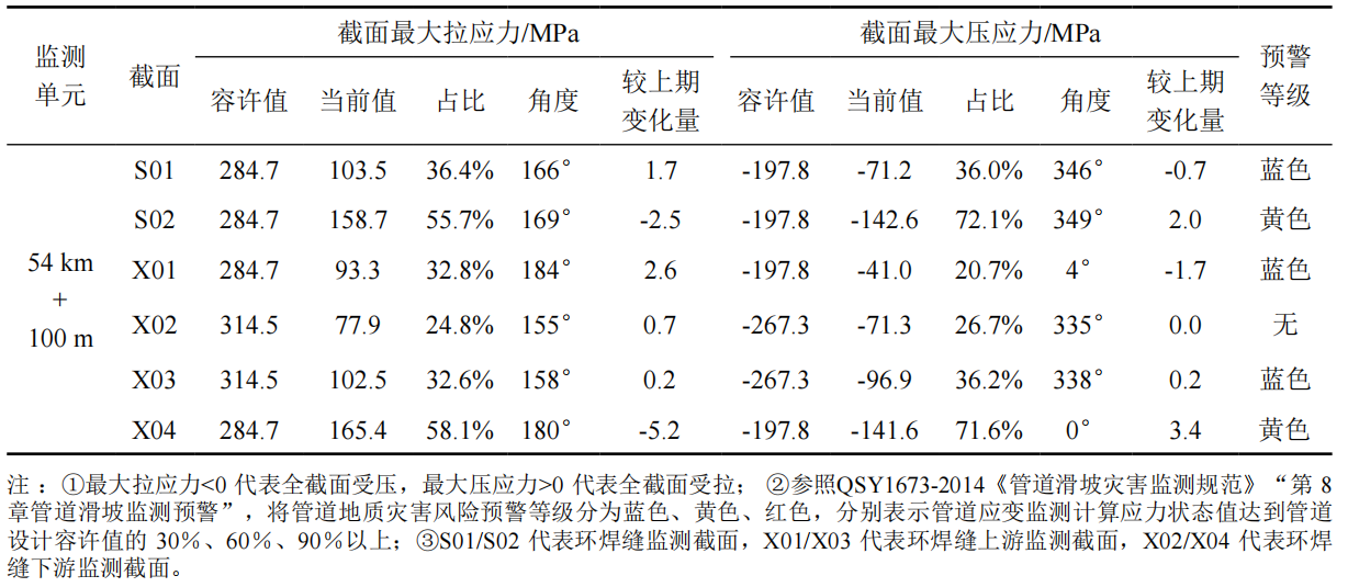 監測數據顯示:環(huán)焊縫監測截面S02軸向附加拉應力最大值為 158.7 MPa、附加壓應力最大值為﹣142.6 MPa。下游監測截面X04軸向附加拉應力最大值為165.4 MPa,軸向附加壓應力最大值為﹣141.6 MPa。各監測截面當前附加應力值及其相應角度,對應的地質(zhì)災害預警等級詳見(jiàn)表 2。