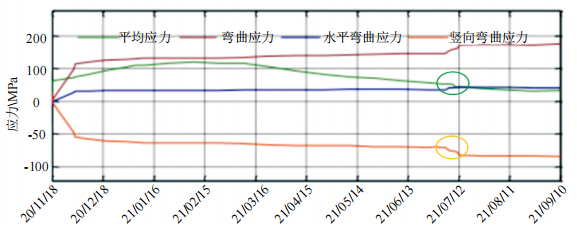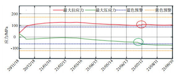 依據本次計算結果,S02/X04 監測截面軸向附加應力值超過(guò)相應容許值的 60%,處于黃色預警級別; S01/X01/X03 監測截面軸向附加應力值超過(guò)相應容許值的 30%,處于藍色預警級別。