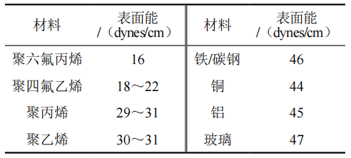 通過(guò)對油田管道內壁結垢機理[3]的研究發(fā)現,降低管道材料的表面能可以減輕輸油管道內壁的結垢程度。通常極性金屬材料的表面能很高,非極性材料的表面能低。因此,具有低表面能的高分子聚烯烴材料成為首選(表 1)。