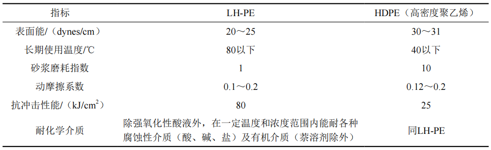 同時(shí)LH-PE分子量很高,材料的耐熱性好,長(cháng)期使用溫度可達到60 ℃以上。其耐腐蝕性、耐磨性超過(guò)了普通聚烯烴,耐氣體阻隔性也比聚烯烴有所提高。LH-PE的主要理化性能及與高密度聚乙烯性能對比見(jiàn)表 2。